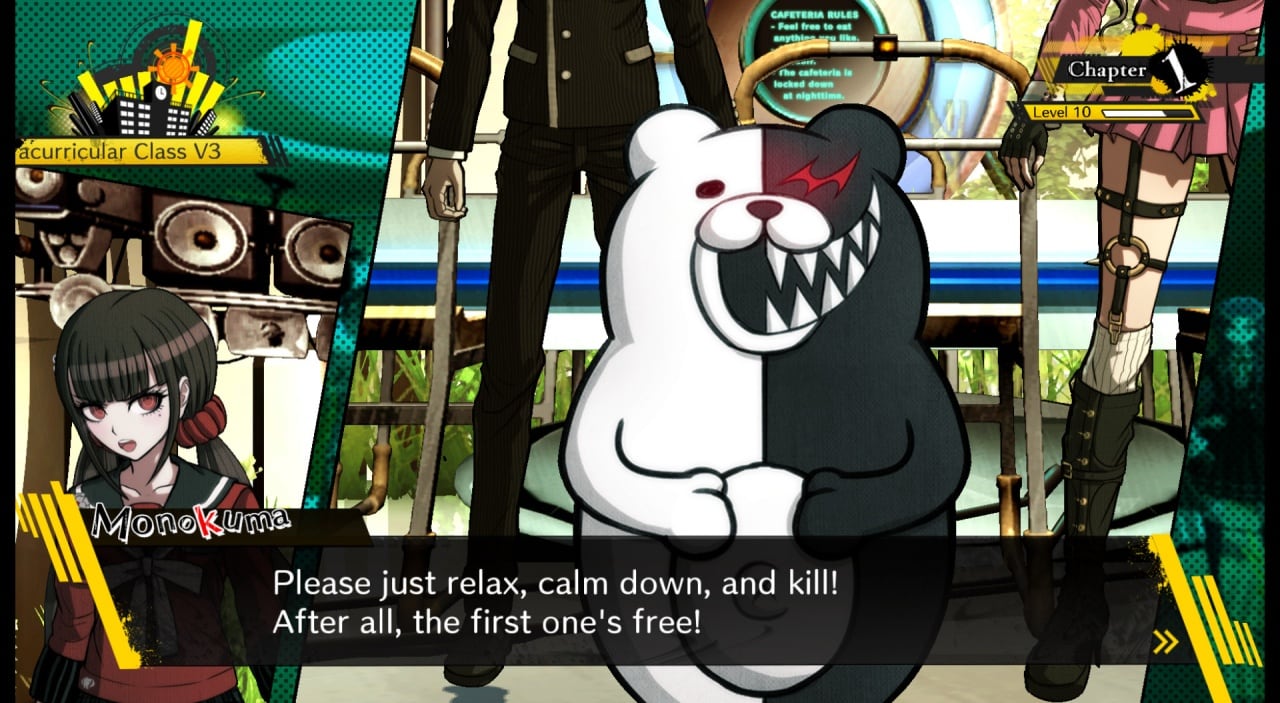 Danganronpa V3: Killing Harmony – третья часть серии загадочных триллеров с элементами визуального романа. Сюжет повествует о похищенном подростке Каэде Акамацу. Вместе с прочими учениками школы его отправляют в училище «Одаренных заключенных». Его основателем является плюшевый медвежонок с именем Монокума. Он рассказывает своим «гостям» о том, что выбраться отсюда получится, только если человеку удастся убить другого ученика так, чтобы никто его в этом не уличил.