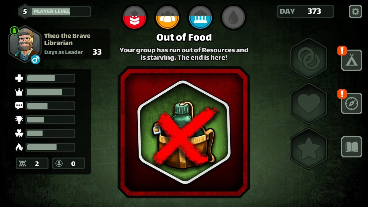 Также здесь нужно отстраивать базу. Остальной игровой процесс напоминает текстовые квесты. В них надо выполнять задания, сражаться с зомби, прокачивать своего протеже, знакомиться с другими уцелевшими путниками и даже крутить романы. Рано или поздно протагонист погибнет. Умереть здесь можно десятками разных способов. Героя могут свергнуть, он может быть укушенным и стать зомби и т. п. На место павшего руководителя придет новый человек, и тогда история продолжится.