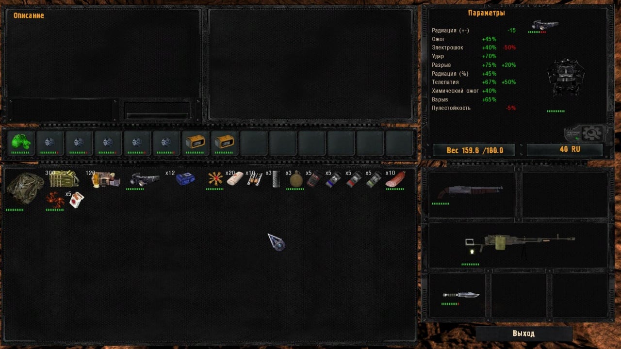 - Метательное, огнестрельное и холодное вооружения разных типов. Игрок воспользуется привнесенными пистолетами, автоматами, дробовиками и другой экипировкой.